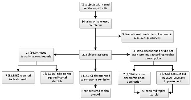 Métodos: Um estudo retrospectivo foi desenvolvido através da análise de prontuários de pacientes com ceratoconjuntivite vernal em tratamento prolongado com tacrolimus tópico 0,03%. A duração do tempo de uso do tacrolimus e as causas de descontinuação da medicação foram usadas para avaliar a adesão ao tratamento. Para avaliar a eficácia da droga, a necessidade e o número de vezes em que corticoides tópicos foram utilizados para controlar os sintomas foram registrados. Os efeitos colaterais relacionados ao uso do tacrolimus foram monitorados para determinar a segurança da droga.