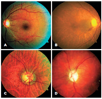 Retinography showed that RNFL defects were detected in five eyes of four chagasic patients and in one control eye. Peripapillary hemorrhage was observed in three eyes of three chagasic patients and in none of the controls. Neural rim notch was observed in three eyes of two chagasic patients and in none of the controls. ON pallor was observed in three eyes of two chagasic patients and in none of the controls; one patient presented localized temporal pallor in both ONs, whereas the other had diffuse ON pallor in one eye (Figure 1).