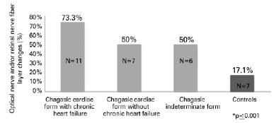 Resultados: Todos os pacientes com doença de Chagas apresentavam estudo cardiológico recente; 15 pacientes (36,6%) apresentavam insuficiência cardíaca; 14 (34,1%) forma cardíaca sem disfunção de ventrículo esquerdo e 12 (29,3%), forma indeterminada. Alterações do nervo óptico/camada de fibras nervosas foram observadas em 24 pacientes (58,5%) do grupo com doença de Chagas e 07 controles (17,1%)