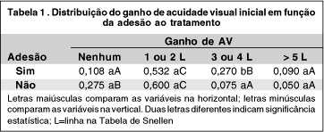 A avaliação do ganho de acuidade visual final em função da adesão ao tratamento mostrou que no grupo em de houve adesão predominou o ganho maior ou igual a 5 linhas (0,414 Tabela 3). Nos que não aderiram corretamente ao tratamento, o ganho de acuidade visual foi semelhante nas diversas faixas avaliadas, não havendo diferença estatística significativa (Tabela 3). Comparando os que aderiram ao tratamento com os que não aderiram, houve predomínio significativo do ganho de 5 ou mais linhas no grupo de adesão (0,414 X 0,150 Tabela 3).