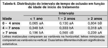 Quanto ao tempo de oclusão, a maioria das crianças com menos de 4 anos ficaram com oclusão por 2 anos ou mais; das com mais que 7 anos, a maioria ficou 1 e 2 anos com oclusão (Tabela 6). A comparação dos grupos entre si mostrou que o tratamento durou menos que 1 ano igualmente acima dos 4 até os 7 anos e acima dos 7 anos, entre 1 e 2 anos principalmente nos de mais de 7 anos e mais que 2 anos principalmente em menores do que 4 anos (Tabela 6).