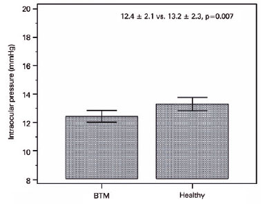 IOP in subjects with BTM was low relative to controls, and was positively correlated with systolic blood pressure. High blood pressure is an important risk factor for IOP(6,9) hypertension causes excessive production of aqueous humor, increased episcleral venous and ciliary arterial pressures, and increased sympathetic activity leading to high IOP(18,19). In a Taiwanese population, Lin et al., reported that of all the variables they measured, blood pressure was the strongest predictor of elevated IOP; this finding is supported by a recent epidemiologic study, as well as the correlation between IOP and systolic blood pressure described herein(20-21). Thus, the lower systolic pressure may be a protective factor for glaucoma in patients with BTM.