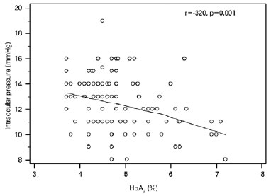 RESULTS: Intraocular pressure in the subjects with beta-thalassemia minor was significantly lower than that in healthy subjects (p=0.007). Additionally, intraocular pressure was inversely correlated with hemoglobin A2 levels (p=0.001, r=-0.320). Serum insulin and systolic blood pressure were significantly higher in subjects with beta-thalassemia minor (p=0.03, p=0.009, respectively).