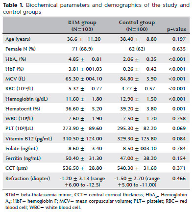 Power analysis (80%) was performed to determine the optimal sample size for the study. Subjects with a history of glaucoma, ocular inflammation such as uveitis, ocular surgery, use any drugs (steroids, beta-blockers, anti-depressants, bronchodilators, etc.), malignancy, and any other acute or chronic disease were excluded. Additinally, women who were breastfeeding or pregnant were also excluded. A total of 203 subjects at least 18 years of age were enrolled in this study. The participants were divided into two study group: 103 subjects with BTM and the control group 100 healthy subjects. The criteria for the diagnosis of BTM were: hemoglobin A2 (HbA2) ≥3.5%, mean corpuscular volume (MCV) <80 fl and hemoglobin F (HbF)=2%-10%.