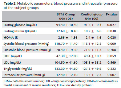 METHODS: We conducted a cross-sectional study comprising of 203 subjects divided into two groups: beta-thalassemia minor (103) and healthy (100).Hemoglobin electrophoresis was performed and complete blood count, blood pressures, serum fasting glucose and insulin levels were measured. All subjects underwent ophthalmological examinations including intraocular pressure measurements.