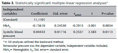 Mean IOP was significantly lower in the BTM group relative to that in the control group (12.4 ± 2.1 mmHg and 13.2 ± 2.3 mmHg, respectively; p=0.007; Figure 1); IOP in the study group was inversely correlated with HbA2 (p=0.001, r=-0.320; Figure 2) and positively correlated with systolic blood pressure (p=0.001, r=0.308; Figure 3). Multiple regression analyses using IOP as the dependent variable and HbA2 and systolic blood pressure as independent variables demonstrated a significant correlation between IOP and HbA2 (p=0.003), as well as systolic blood pressure (p=0.01; Table 3).