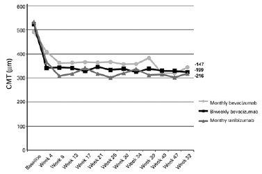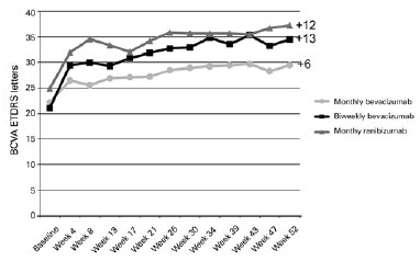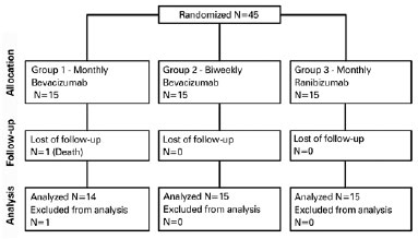 We observed a tendency toward greater vision improvements in the monthly ranibizumab and fortnightly bevacizumab groups compared to those in the monthly bevacizumab group. But we cannot identify the exact reason for this finding that might represent a true better response in groups 2 and 3 (our small sample size did not allow us to confirm this). However, another possibility is that patients included in the monthly bevacizumab group had a more severe baseline disease, despite the randomization, and we could not rule this out for the same reason. To us, this hypothesis seems more plausible, considering the findings in the literature regarding vision gains.