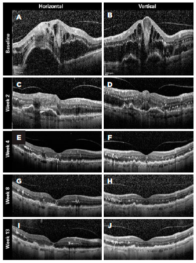 Figures 4-6 present three representative clinical cases with good treatment responses. Figure 4 presents a patient from group 1 with a large PED showing excellent response since the beginning of the treatment. Figure 5 shows the first 3 months of follow-up for a patient from group 2, who was treated every 2 weeks with fixed injections in all first six study visits and was then followed with retreatments as needed. Despite the case severity, the patient progressed with a good treatment response. Figure 6 presents a representative case from group 3.