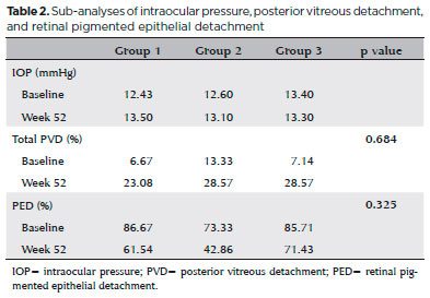 All groups showed a tendency toward total PVD increases over 12 months of follow-up. However, we observed no statistically significant differences in the vitreous statuses either within each group or between groups. We had thought that the patients receiving fortnightly doses would probably show a greater tendency toward PVD, due to the repeated injections, regardless of the medication. But we cannot confirm or rule out the possibility due to the small sample size and because group 2 already had more patients with total PVD at baseline. Studies with a bigger sample size should evaluate PVD changes with more frequent injection protocols.