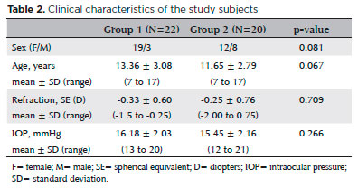 Results: The study group included 19 girls and 3 boys in Group 1 and 12 girls and 8 boys in Group 2 (p=0.081). Thyroid-associated ophthalmopathy was not identified in any of the patients. Mean tear film osmolarity was 310.23 ± 11.98 mOsm/l in Group 1 and 313.60 ± 15.03 mOsm/l in Group 2 (p=0.424). Mean Schirmer test score was lower in Group 1 (14.91 ± 6.27) compared with Group 2 (23.60 ± 5.63) (p=0.001). Mean tear film breakup time was lower in Group 1 (11.78 ± 4.07) compared with Group 2 (15.1 ± 1.6) (p=0.013). Moreover, mean meibomian gland area loss was 25.01% ± 10.04% in Group 1 and 16.54% ± 6.02% in Group 2 (p=0.002). Conjunctival cytologic analysis in Group 1 revealed grade 0 changes in 6 patients (27.3%), grade 1 changes in 14 patients (63.6%), and grade 2 changes in 2 patients (9.1%), whereas 18 patients (90%) had grade 0 changes and 2 patients (10%) had grade 1 changes (p=0.001) in Group 2.