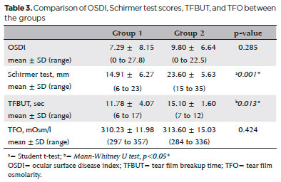 Ocular surface staining with fluorescein was not performed in either group. There was no ocular surface staining with fluorescein in both groups. Results of the OSDI, Schirmer test, TFBUT analysis, and TFO measurements are presented in table 3. The Schirmer and TFBUT test results were significantly lower in Group 1 compared with Group 2 (p=0.001 and p=0.013, respectively). No significant differences were observed in the OSDI (p=0.285) or TFO measurements (p=0.424).