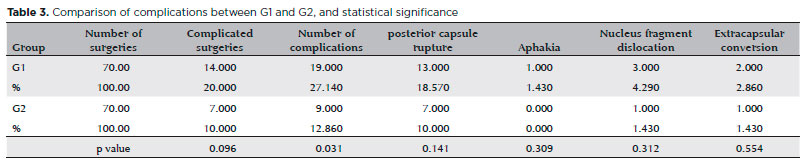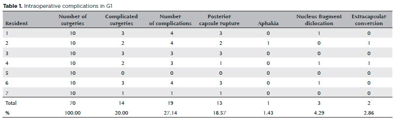 Fourteen of the 70 surgeries performed by G1 had some type of complication (20%). The total number of these complications was 19 (27.14%), and they involved 13 posterior capsule ruptures (18.57%), one aphakia (1.43%), three eyes with nucleus fragment dislocation into the vitreous cavity (4.29%), and two conversions to ECS (2.86%), as detailed in table 1.