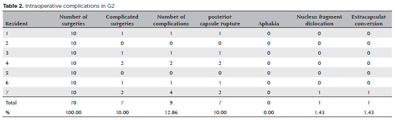 A study conducted some dozen years ago to assess the risks of cataract surgery performed by residents in a Brazilian university hospital showed that 13.4% of the phacoemulsification procedures performed by third year residents throughout the year had complications(16). This value is smaller than the results produced by our G1 (20%), but higher than our G2 (10%) residents. However, this earlier study included all operations performed by residents. In that investigation, residents started performing phacoemulsification only in the third year, and therefore had generally acquired more surgical skills in the first two full years of residence. In contrast, our study involved residents who began using this technique only in the middle of the second-year of residency.