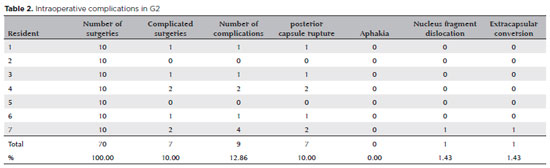Results: A total of 140 surgeries were performed, 70 by Group 1 and 70 by Group 2. The total number of complications was 19 (27.14%) in Group 1 and nine (12.86%) in Group 2, and this reduction was significant (p=0.031). Fourteen (20%) surgeries in Group 1 and seven (10%) in Group 2 had complications. The complications were 13 posterior capsule ruptures (18.57%) in Group 1 and seven (10%) in Group 2; three eyes had nucleus fragment dislocations (4.29%) in Group 1, but only one (1.43%) in Group 2; two extracapsular conversions (2.86%) occurred in Group 1 and one (1.43%) in Group 2; and there was one aphakia (1.43%) in Group 1.