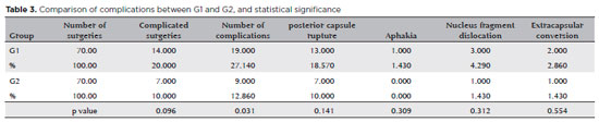 Resultados: Foram realizadas 140 cirurgias, sendo 70 pelo Grupo 1 e 70 pelo Grupo 2. O número total de complicações foi de 19 (27,14%) no Grupo 1 e nove (12,86%) no Grupo 2, e esta redução foi significativa (p=0,031). Quatorze (20%) cirurgias no Grupo 1 e sete (10%) no Grupo 2 tiveram complicações. As complicações foram 13 rupturas de cápsula posterior (18,57%) no Grupo 1 e sete (10%) no Grupo 2, três olhos com luxação de fragmento de núcleo para o vítreo (4,29%) no Grupo 1 e um (1,43%) no Grupo 2, duas conversões extracapsulares (2,86%) no Grupo 1 e uma (1,43%) no Grupo 2 e uma afacia (1,43%) no Grupo 1.