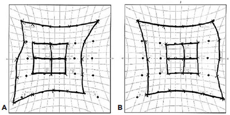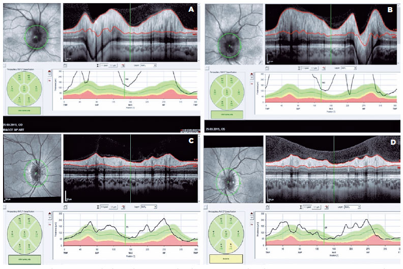 In the primary position, we observed esotropia and vertical deviation worsening on downgaze. Bielshowsky’s diagnostic head-tilt test was positive to both the left and right, and there was evidence of bilateral superior oblique muscle weakening on the Hess chart(4) (Figure 2). Optic coherence tomography (OCT) showed severe optic disc swelling, indicating true papilledema (Figure 3). From a computerized visual field examination (VFE) using the Humphrey visual field analyzer, we found a bilateral blind spot enlargement.