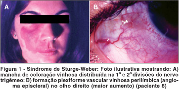 A síndrome de Sturge-Weber ou angiomatose encefalotrigeminal é uma doença neuro-oculocutânea congênita com malformações que acometem primordialmente o sistema vascular cefálico, sendo caracterizada por angiomas distribuídos principalmente nas 1ª e 2ª divisões do quinto nervo craniano (Figura 1).