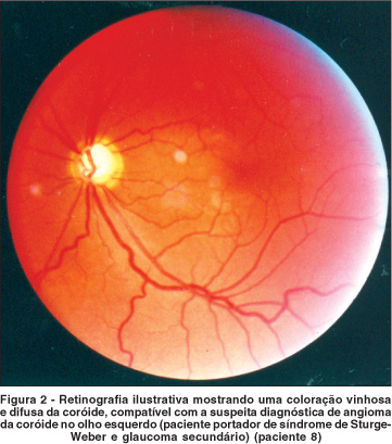 Em nosso meio(12), realizou-se estudo em portadores de síndrome de Sturge-Weber em que foi feita a medida da Pv em 38 olhos: 16 com glaucoma unilateral e 22 sem glaucoma numa casuística de 58 pacientes. A Pv foi medida em cm3H2O utilizando-se um instrumento acoplado à lâmpada de fenda Haag-Streit pelo qual uma câmara de pressão com uma fina membrana transparente foi aplicada ao vaso episcleral observando-se o colapso da veia sobre o qual a câmara estava apoiada. Multiplicando-se o valor em cm3H2O por 0,734 obteve-se a Pv em mmHg. A Pv normal não varia com a idade. Encontraram Pv elevada (superior a 9 mmHg) em todos os 16 olhos glaucomatosos mas também em três olhos contralaterais normais (sem angioma episcleral e sem glaucoma). Foi encontrada Pv também elevada em dois olhos com angioma episcleral sem glaucoma. Não encontraram explicação para o aumento da Pv nos dois olhos com angioma episcleral sem glaucoma e nos três olhos normais (sem angioma episcleral e sem glaucoma). Esses mesmos autores(12), utilizando uma sonda de 8 MHz do Eco-oftalmógrafo Kretz modelo 7200 MA, mediram também a espessura da coróide de olhos com síndrome de Sturge-Weber encontrando grande aumento da mesma em todos os olhos com angioma de coróide reconhecido pela oftalmoscopia (Figura 2).