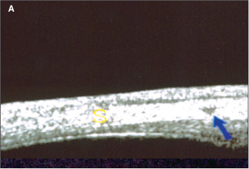 Paciente 4: 11 anos, sexo feminino, leucodérmica. História de convulsões na infância, sendo usuária de primidona (250 mg ao dia). Ao exame, apresentava hemangioma facial bilateral acometendo pálpebras e pescoço; acuidade visual igual a 0,35 no OD e 0,7 no OE, sob correção; Po igual a 36 mmHg no OD e 32 mmHg no OE; à biomicroscopia, mostrava formação plexiforme vascular vinhosa no limbo nasal e temporal em AO; à gonioscopia, seio camerular do tipo intermediário com a raiz da íris aparentemente implantada ao nível do esporão escleral; à fundoscopia, mostrava papila atrófica com escavação de 0,9 no OD e papila rósea com escavação de 0,4 a 0,5 no OE e angioma de coróide em AO. Foi submetida a trabeculectomia com mitomicina C (0,3 mg/ml durante três minutos), de urgência, em AO, usando-se no pré-operatório 250 ml de manitol IV. Os achados da UBM realizada sob timolol, antes da cirurgia, foram em AO: imagem triangular intra-escleral de média ecogenicidade no quadrante superior compatível com vaso intra-escleral dilatado (similar à fig. 3a); imagem arredondada de baixa a média ecogenicidade no interior do corpo ciliar nos quadrantes superior e temporal, compatível com vaso intraciliar dilatado ou angioma do corpo ciliar (similar à fig. 3b); efusão supraciliar (fig. 4, seta amarela) e descolamento da pars plana nos quadrantes superior e inferior no OD e no quadrante temporal no OE; imagem intra-escleral em fenda, de trajeto oblíquo, compatível com a possibilidade de vaso ou canal emissário (fig. 4, seta azul) no quadrante superior do OD. Quatorze meses após a cirurgia, a paciente apresentava Po igual a 6 mmHg sem medicação em AO. Repetiu-se a UBM em AO, encontrando-se achados similares aos do pré-operatório.