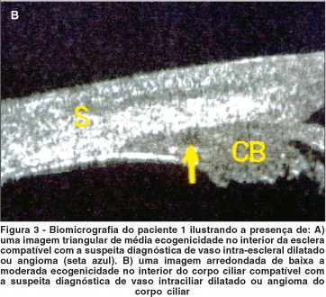 Paciente 3: 5 anos, sexo masculino, leucodérmico. História negativa de convulsão. Ao exame inicial aos 5 meses de vida, apresentava hemangioma facial à direita. Po igual a 5 mmHg no OD e 2 mmHg no OE; à biomicroscopia, apresentava formação plexiforme vascular vinhosa perilímbica no OD; à gonioscopia, seio camerular amplo com sangue no canal de Schlemm do OD; a parede externa do seio camerular mostrava-se descoberta com franjado pectíneo na frente da faixa ciliar como prolongamento da periferia da íris em AO. À fundoscopia, apresentava escavação papilar de 0,2 a 0,3 no OD com a possível presença de angioma de coróide neste olho e escavação papilar de 0,1 a 0,2 no OE. Essa criança foi acompanhada durante quatro anos no Serviço tendo desenvolvido no OD glaucoma refratário ao tratamento clínico. Foi submetida a trabeculotomia no OD, com bom controle da Po sem medicação. Os achados da UBM realizada no OD, sem medicação, cerca de 20 dias após a cirurgia, foram: imagem triangular intra-escleral de média ecogenicidade no quadrante superior compatível com vaso intra-escleral dilatado (similar à fig. 3a); imagem arredondada de baixa a média ecogenicidade no interior do corpo ciliar também no quadrante superior, compatível com vaso intraciliar dilatado ou angioma do corpo ciliar (similar à fig. 3b).