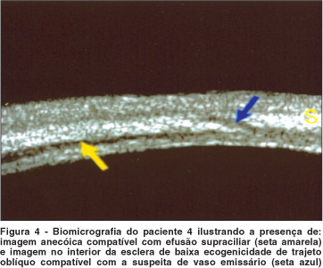 Paciente 8: 26 anos, sexo feminino, leucodérmica. História de convulsão negativa. Ao exame inicial, realizado aos 13 anos de idade, apresentava angioma facial bilateral; acuidade visual igual a 1,0 sem correção, em AO; Po igual a 23 mmHg no OD e 18 mmHg no OE, sem medicação; à biomicroscopia, apresentava formação plexiforme vascular vinhosa perilímbica em AO; à gonioscopia, seio camerular amplo com canal de Schlemm exangue no OD, porém com sangue no OE; à oftalmoscopia, apresentava papilas com escavações assimétricas (0,6 a 0,7 no OD e 0,5 no OE) e angioma de coróide em AO. A paciente desenvolveu glaucoma bilateral e foi submetida a trabeculectomia em AO (OD em 1989 e OE em 1990) com o uso pré-operatório de 250 ml de manitol IV. Atualmente, a Po encontra-se sob controle (17 mmHg) em AO sob levobunolol, uma gota duas vezes ao dia. Os achados da UBM, realizada em AO, respectivamente 12 e 11 anos após a cirurgia e sob levobunolol, foram: imagem triangular intra-escleral de média ecogenicidade nos quadrantes superior e inferior no OD e no quadrante inferior no OE compatível com vaso intra-escleral dilatado (similar à fig. 3a); imagem arredondada de baixa a média ecogenicidade no interior do corpo ciliar nos quadrantes nasal e inferior no OD e nos quadrantes superior e inferior no OE, compatível com vaso intraciliar dilatado ou angioma do corpo ciliar (similar à fig. 3b) e efusão supraciliar (similar à fig. 4, seta amarela) no quadrante temporal em AO.