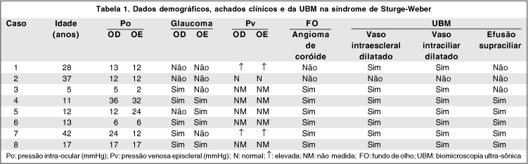 Kranemann et al(15), utilizando a UBM, estudaram um caso de glaucoma associado à síndrome de Sturge-Weber. Os autores relataram ter encontrado efusão supraciliar em 360°, vasos superficiais e intra-esclerais dilatados e seio camerular aberto, porém estreito, com o estreitamento provavelmente causado por alguma rotação do corpo ciliar secundária à efusão supraciliar. Estas alterações, segundo esses autores, sustentariam a hipótese de o aumento da pressão venosa episcleral (não medida por eles) ser a causa da elevação da pressão intra-ocular. Este foi o único relato da literatura compulsada empregando a UBM no estudo da síndrome de Sturge-Weber.