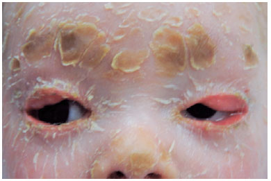 Lamellar ichthyosis has an estimated incidence of 1:250,000 to 300,000(16). It presents with a defective skin desquamation that leads to keratin scales of the total body surface, excessive dryness, and hard contracture, which prevents eyelid closure and leads to ectropion (Figure 2). The incidence of cicatricial ectropion in these patients varies between 45 to 80%(17). Other common ocular signs include chronic conjunctivitis and exposure, keratitis with corneal ulceration, and even bilateral spontaneous corneal perforation(18).