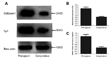 Western blot analysis was used to assess the protein expression levels of Sp1 and collagen I in the pterygial and conjunctiva tissues. As shown in figure 1, protein expression levels of Sp1 and collagen I were significantly greater in the pterygial tissues than they were in the conjunctival tissues (p<0.05).