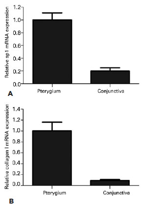 Figure 2. (A) Comparison of changes in mRNA expression profiles of Sp1 in pterygial and conjunctival tissues, p<0.05. (B) Comparison of changes in mRNA expression profiles of collagen I in the pterygial and conjunctival tissues, p<0.05.