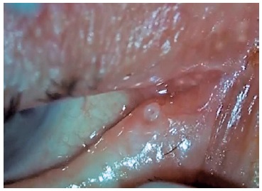 In the preoperative examination, the fluorescein dye disappearance test took longer than 5 min in all eyes. Biomicroscopic evaluation showed that 23 (42.5%) puncta had membranous closure (Grade 1, Figure 3) and 31 (57.5%) eyes had a punctum diameter smaller than normal (Grade 2, Figure 4). Although correct care information was given for wiping and face washing, at the 1-month follow-up, 10 plugs had fallen out. At the 3-month follow-up, nine more had fallen out. By the sixth month, eight more had been lost. Thus, by the sixth month, of the 54 plugs, 26 plugs (48.1%) had fallen out (two were in the canaliculus) and only 28 (51.9%) had stayed in place.
