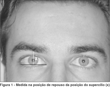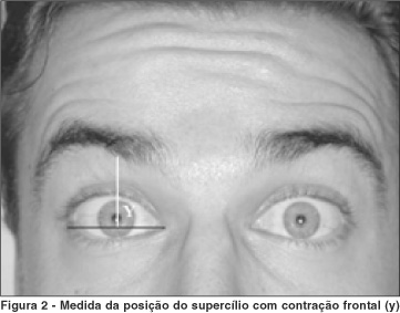 Todas as imagens foram parametrizadas (determinação da relação pixel/ milímetro) por meio de um detalhe de distância conhecida (diâmetro horizontal corneano = 12 mm). A variável medida foi a excursão do supercílio (Y-X) tomada como índice do grau de ação do músculo frontal.