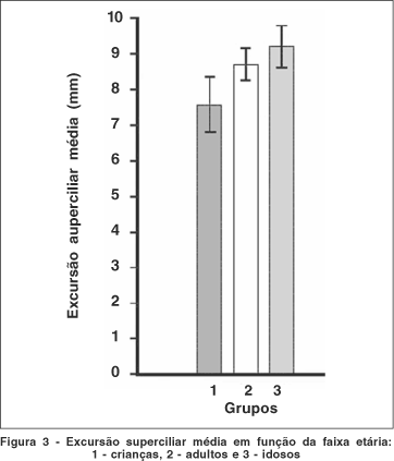 Os dados obtidos mostram que, apesar da mobilidade média ter aumentado com a faixa etária, essa diferença não foi estatisticamente significativa e, portanto, pode-se afirmar que, independentemente da idade, o supercílio é deslocado pela ação frontal na sua porção central em média de 7,5 a 9,2 mm em pessoas normais.