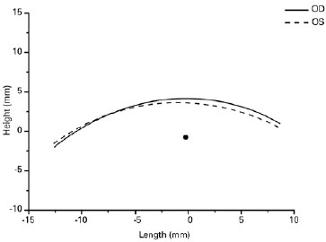 The degree of agreement between the two contours was also estimated by measuring a coefficient of overlap of two curves (POC). To calculate the degree of overlap of the right and left contours, the mid-pupil center point was used to superimpose the two lines (the left contour was flipped to match the lateral and medial portions of the two contours), and the software compared the two lines point-to-point, expressing their agreement as a percentage (Figure 4).