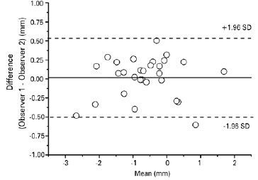 The coefficient of overlapping of the lid contours determined by the two observers ranged from 93.5% to 98.8%, with a mean of 96.1% ± 1.6% SD. The differences between observers in the position of the peak contour were very small, with a mean value of 0.02. The distribution of these differences ranged from 0.54 to -0.5 mm, as shown by the Bland-Altman plot (Figure 6).