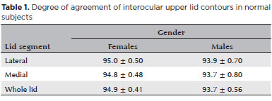 Resultados: O coeficiente de superposição obtidos por observadores independentes variou ente 93,5% e 98,8% com média de 96,1% ± 1,6 DP. A diferença das médias da localização do pico do contorno palpebral foi de 0,02 mm. A simetria entre os contornos dos olhos direito e esquerdo não diferiu entre o sexo feminino e masculino e esteve na faixa de variabilidade do método para o coeficiente de superposição e localização do pico do contorno.