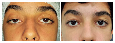 Previous studies(2,6,13) have shown variable reoperation rates (ranging from 1% to 13%), which correspond to our results (11.8%). We found an infection rate (3.9%) similar to that of previous studies (ranging from 1.7% to 4.3%), and the number of cases in which reoperation was not performed (88.2%) was also similar to frontalis transfer rates (ranging from 81.1% to 87.9%)(9,15). The most common complication is undercorrection (ranging from 10% to 15%), although numerous other factors should be assessed, such as eyelid function, corneal protection, diplopia, scarring, and eyelid contour(2).