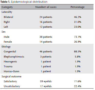 Resultados: Incluímos um total de 76 pálpebras de 52 pacientes em nosso estudo. Com um tempo médio de seguimento pós-operatório de 16,8 ± 18,5 meses (intervalo 3-95), 59 (77,6%) pálpebras apresentaram desfecho satisfatório e 17 (22,4%) insatisfatórios (8 casos de assimetria, 3 granulomas, 3 extrusões de sutura, 2 abscessos e 1 caso de celulite). Nove pálpebras do grupo insatisfatório necessitaram de reoperação. Entre os pacientes com seguimento≥12 meses (38 cirurgias), resultados duradouros foram observados na maioria dos casos, exceto por 2 extrusões de sutura de surgimento tardio.