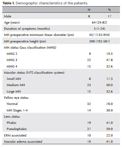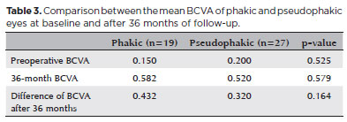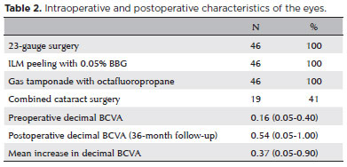 The average age of the 46 patients (38 women, 8 men) was 64 years (range: 24-82 years). According to the IVTS Group Classification of Vitreomacular Adhesion, Traction, and Macular Hole1, 8 eyes had small MHs, 23 had medium MHs, and 15 had large MHs (Table 1). Anatomic closure was achieved in 42 (91.3%) eyes after one procedure and in 45 (97.8%) eyes after the second surgery. The mean BCVA was 0.16 (range: 0.05-0.40) decimal preoperatively and 0.54 (range: 0.05-1.00) decimal after 36 months, with a median postoperative BCVA improvement of 0.37 (range: 0.05-0.90) decimal (Table 2). BCVA improved in all eyes, and the patients were followed up for at least 36 months (range: 24-81 months). A subgroup analysis comparing the BCVA improvements in phakic and pseudophakic patients showed that the former group achieved better results, although this finding was not statistically significant (p=0.579). This result is expected once cataract surgery itself can improve the BCVA (Table 3).