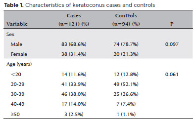 METHODS: The study group included 121 unrelated keratoconus patients and 94 unrelated healthy controls. Blood samples (200 ml) were collected from all patients and controls to isolate genomic DNA. Genotyping was performed to identify rs1001179, rs4880, and rs1050450 using real-time polymerase chain reaction (PCR). Genotype and allele frequencies were calculated; their associations with keratoconus risk were assayed, and the association with keratoconus risk and demographic factors was examined.