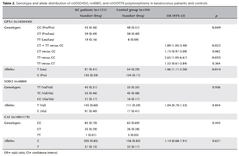 RESULTS: Glutathione peroxidase 1 rs1050450 polymorphism was present in 41% cases compared with 29% controls (OR=1.66; 95% CI=1.11-2.50; p=0.014). No association was observed between catalase rs1001179 and SOD2 rs4880 polymorphisms and keratoconus (for all, p>0.05).