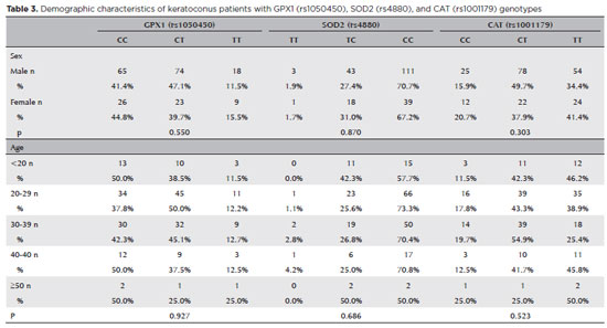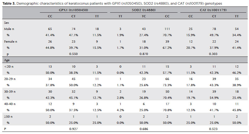 In our study, the GPX1 (rs1050450), SOD2 (rs4880), and CAT (rs1001179) polymorphisms did not impact the risk of KC with respect to sex (p=0.550, 0.870, 0.303, respectively) and age (p=0.927, 0.686, 0.523, respectively).