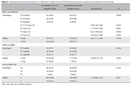 RESULTADOS: O polimorfismo da glutationa-peroxidase 1 rs1050450 estava presente em 41% dos casos, comparado com 29% dos controles (OR=1,66, IC 95%=1,11-2,50; p=0,014). Não foi observada associação entre o ceratocone e os polimorfismos rs1001179 e SOD2 rs4880 da catalase (para todos, p>0,05).