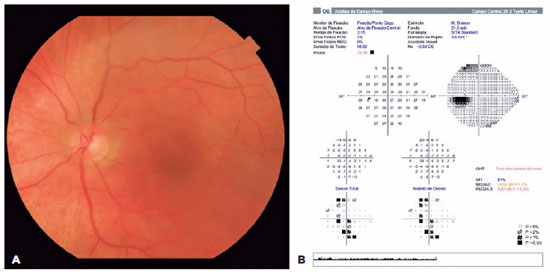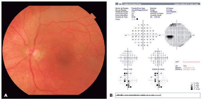 Best corrected visual acuity (VA) was 20/25 in the right eye (OD) and 20/60 in OS. Pupils were equal in size and normally reacted to light and near, with no afferent pupillary defect. Slit-lamp examination revealed no abnormal findings; intraocular lenses were topics with no signs of anterior inflammation or posterior capsule rupture OU. Intraocular pressure was 16 mmHg OU. Fundus examination revealed blurred optic disc margins and circumpapillary posterior vitreous adhesion in a ring shape around the optic disc and a thin macular epiretinal membrane (ERM; Figure 1A). Visual field (VF) examination using the Humphrey 24-2 SITA-Standard protocol showed a mild, generalized diffuse reduction of sensitivity and blind-spot enlargement (Figure 1B).