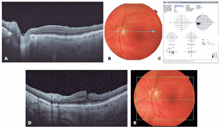 Under normal aging conditions, the vitreous tends to detach from the posterior pole, thus increasing the incidence of PVD in elderly people8. However, the attachment of the vitreous to the optic disc margin may persist even if the vitreous is detached elsewhere. Such occurrence can be justified by cellular proliferation from the optic nerve head (ONH) with the formation of an epipapillary membrane. In our cause, we believe that this proliferation was associated with an anomalous PVD, resulting in vitreoschisis, a condition in which the posterior vitreous cortex splits with forward displacement of the anterior cor tex portion, leaving part of the posterior layer of the cor tex attached to the retina. Moreover, the remaining membranes adherent to the optic disc contract, resulting in anteroposterior traction onto ONH.