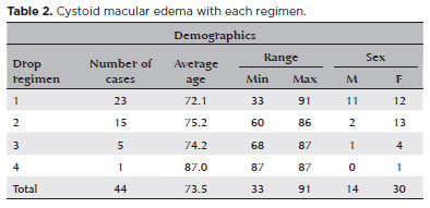 The present retrospective chart review study was approved by the Wake Forest Baptist Health institutional review board. The study was performed in accordance with the tenets of the Declaration of Helsinki. We enrolled in the study 5,393 eyes of patients who underwent routine cataract surgery with intraocular lens placement. Surgeries were performed by three surgeons in the John Galt Outpatient Surgery Center at the Wake Forest Baptist Medical Center Department of Ophthalmology (Winston-Salem, North Carolina, USA). The study period went from July 2007 to December 2012. All cataract surgeries were performed using phacoemulsification under topical local anesthesia. All surgeons had equivalent years of experience and performed surgery using similar equipment, techniques, and small intraocular lenses in subjects from the same patient population. CME was diagnosed based on vision worsening and evidence of macular thickness' increase on optical coherence tomography (OCT) post-cataract surgery. Typically, an OCT was ordered exclusively if the patient's vision declined post-cataract surgery. Additional data collected included the following: patient demographics, date of cataract surgery, date of CME diagnosis, OCT confirmation of CME, and preoperative, perioperative, and postoperative therapeutic regimens.