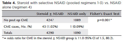 Table 3 provides a comparison for rate of CME development among the four different therapeutic regimens, as well as the comparative statistics. Of note, Fisher's exact test showed that the rate of CME development was significantly lower in therapeutic regimen #4 vs. therapeutic regimen #1 and #2. More importantly, when pooling the three corticosteroid regimens together, CME developed in 43/4290 cataract surgeries (1.0%) compared to 1/1090 cases in the NSAID alone group (0.09%). As described in table 4, findings show a statistically significant approximate 11-fold reduction in CME (p=0.001).