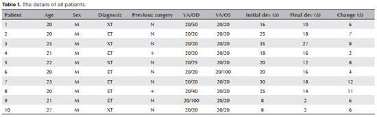 All patient data are represented in table 1. Ten male patients with a mean age of 21.7 (20-27) years participated in this study and were divided into two groups: 6 with esotropia (Group 1) and 4 with exotropia (Group 2) The treatment outcomes were compared between these groups. None of the patients had undergone chemodenervation or strabismus surgery within the last 6 months.