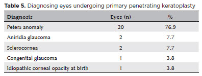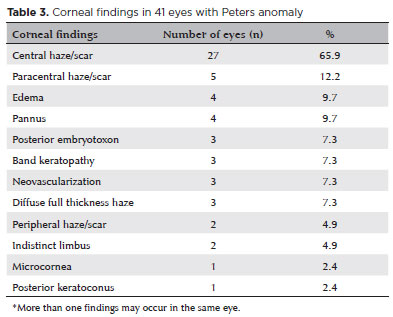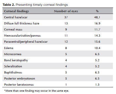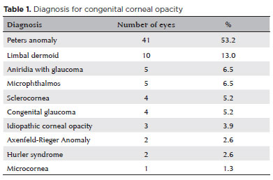 Resultados: Um total de 77 olhos de 56 pacientes foi examinado. A idade média de apresentação foi de 32,8 ± 44,2 meses, com um tempo médio de acompanhamento de 26,7 ± 30,1 meses. O diagnóstico mais frequente foi anomalia de Peters (53,2%), seguido por dermóide límbico (13,0%), aniridia com glaucoma e microftalmia (6,5%), esclerocórnea e glaucoma congênito (5,2%), idiopático (3,9%), síndrome de Axenfeld-Rieger e síndrome de Hurler (2,6%) e microcórnea (1,3%). Ceratoplastia primária foi realizada em 26 olhos, com desfecho de córnea clara de 76,0% durante o acompanhamento.