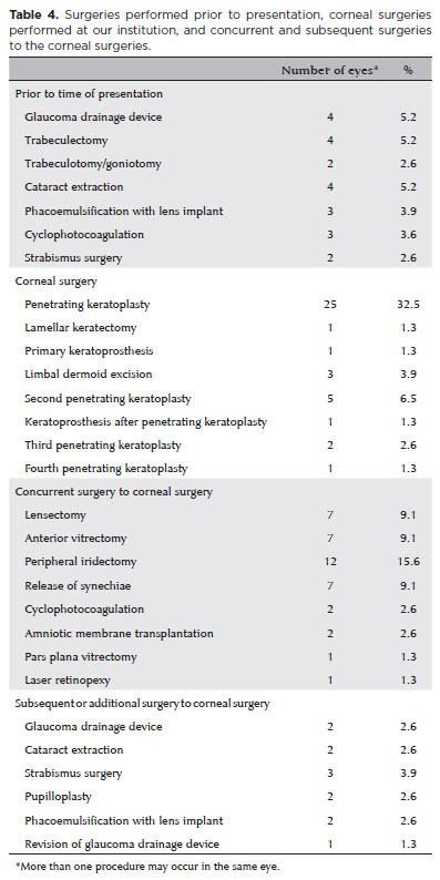 Glaucoma was observed in 24 eyes (31.2%) prior to their first visit or during our follow-up at Wills. Glaucoma surgeries were performed 13 eyes prior to their first visit including four glaucoma drainage devices, four trabeculectomies, 3 cyclophotocoagulations, and two tra beculotomy/goniotomy procedures. Concurrent glaucoma surgeries were performed in two eyes (cyclophotocoagulation) at the time of corneal surgery. Additionally, subsequent glaucoma surgeries were performed in two eyes, and revision of a glaucoma drainage device was performed in one eye after a corneal surgery (Table 4). Seven of the 24 eyes were followed with medical glaucoma treatment. The correlation between the presence of glaucoma and history of previous surgery before the presentation was statistically significantly moderately positive (r=0.498, p=0.010). Concurrent intervention at the time of primary keratoplasty was statistically mo derately correlated with the need for secondary keratoplasty (r=0.445, p=0.026). The outcome rate in the clear cornea during the follow-up was 76.0%.