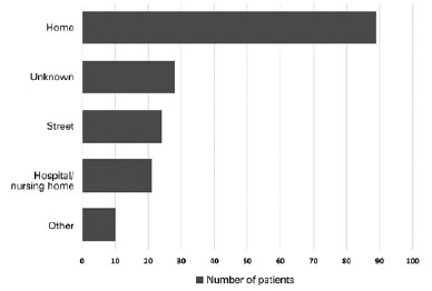 The most common mechanisms of injury were falls (77.8%) and pedestrian/motor vehicle accidents (6.8%) (Figure 1). Females had a 1.91-fold greater risk of eye trauma from a fall than males (95% CI=1.01-3.62, p=0.048). Documented locations of falls were at home (51.7%), on the street (13.9%), and in hospitals/nursing homes (12.2%) (Figure 2). Those falling at home were older than those falling at other locations (mean age=83.4 [95% CI=81.8-85.4] vs. 78.8 [95% CI=77.0-80.6] years, respectively, p=0.0002). Those falling in the bathroom were also older than those not specified as falling in the bathroom (mean age 91.25 [95% CI=85.3-97.2] vs. 80.7 [95% CI=79.4-82.0] years, respectively, p=0.0001; Table 3). In this elderly population, 14.5% were diagnosed with visual impairment or blindness, as defined by criteria of the World Health Organization(15), and 33.1% were diagnosed with cognitive impairment (dementia or psychiatric disorders). The clear majority of falls occurred at ground level (syncope, loss of balance, tripping, and stumbling), although stairs were implicated in 15.7% of cases.